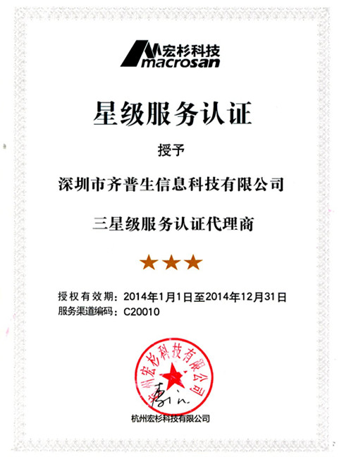 2013年12月,齊普生公司再傳喜訊:榮獲杭州宏杉科技有限公司(以下簡稱:宏杉科技)三星級服務(wù)認(rèn)證代理商資格證書!